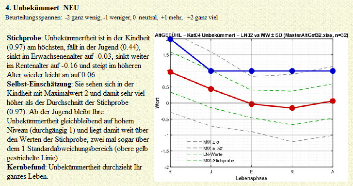 Es gingen 33 Fragebogenbearbeitungen ein, 32 davon vollständig auswertbar (17 Männer, 15 Frauen; Durchschnittsalter 69.7) Die ersten Probeauswertungen sind interessant und vielversprechend. Es bahnen sich grundlegend neue Erkenntnisse zum Erleben an (EB143, EB144). Auswertung Stichprobe: Hier interessieren in der Regel die Statistik der soziobiographischen Daten, wie z.B. Alter, Geschlecht, Schulbildung, Berufe, ...; Bearbeitungsdaten z.B. Befinden bei Bearbeitung, Interesse am Thema, Bearbeitungsdauern, Anzahl Missing Data, ...; Sachfragen. Von den statistischen Kennwerten sind in der Regel Anzahl n, n%, Mittelwerte, Standardabweichungen, Minima, Maxima, Verteilungen interessant und üblich. Und es interessieren natürlich die Ergebnisse nach Kriterien, wie Alter, Bildung, Geschlecht, Beruf, Interesse am Thema, Befinden bei Bearbeitung, Dauer der Bearbeitung, Anmerkungen und Kritik, Ruhestand, Rentenstatus, sonstige Tätigkeiten. Einzelauswertungen: Die Einzelauswertung enthält die allgemeinen Ergebnisse und individuellen Werte im Vergleich zur Stichprobe. Es ist PDF Format angestrebt, der Umfang wird ca. 15 Seiten betragen und wird daher nicht mit der Post verschickt, sondern nur auf Wunsch als Mailanhang geliefert. Beispiel: