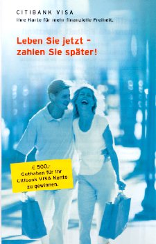 Citibank: Daß ich die Citibank ausgewählt habe, hat rein praktische Gründe. Ich habe dort ein Konto, bin auch ganz zufrieden und bekomme regelmäßig Prospekte, die meine Frau gesammelt hat. Dadurch hat sich im Laufe der Jahre eine interessante Sammlung ergeben, die es mir nun einfach machte, diese Beispiele zu präsentieren. Allerdings war erst ein Briefwechsel nötig, um der Citibank klar zu machen, daß ich einen viel niedrigeren Kreditrahmen wünschte ;-) als sie mir einräumten, um möglichen Schaden bei falschen Internetabbuchungen zu begrenzen.