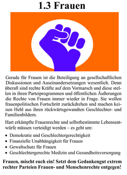 Es wurde zu bedenken gegeben, was Frauen hier genau bedeutet (Trans, Inter, ...). Wir denken, für ein Postkartenformat sollte Frauen genügen.